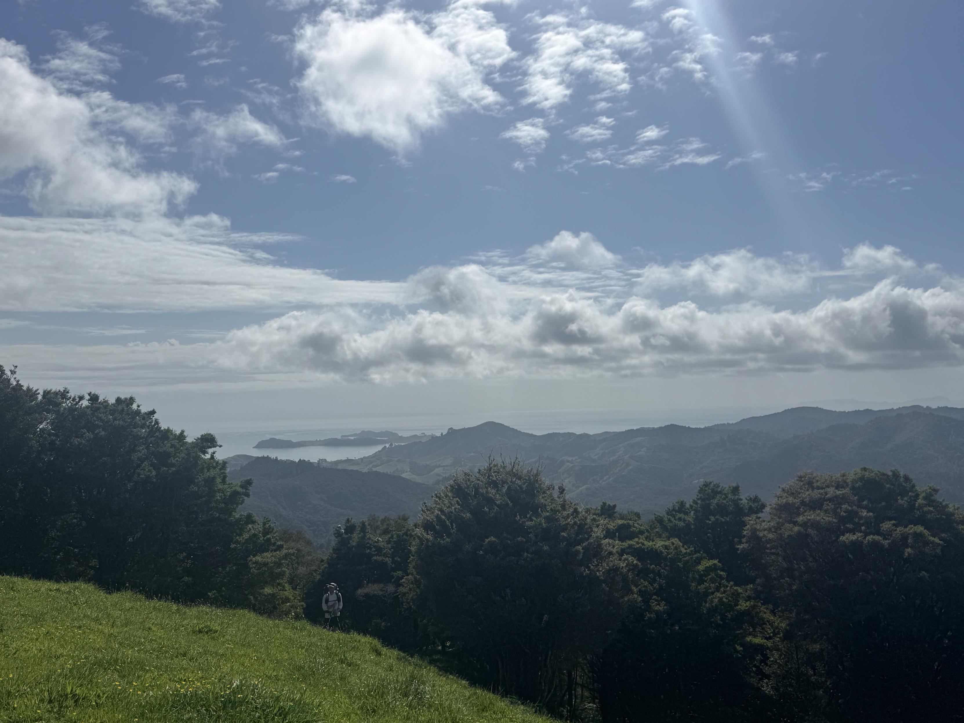Nach einem Shuttle-Start (18km Straße gespart) in den Helena Ridge Track. Sehr gut ausgebaut und schön gemacht. Alte Kauri Bäume im Urwald, dann über Farmland zur Straße. Nach ca. 13km einen Hitch nach Whahanaki bekommen, der zusätzliche Straße erspart hat. Einfach nett diese Neuseeländer…